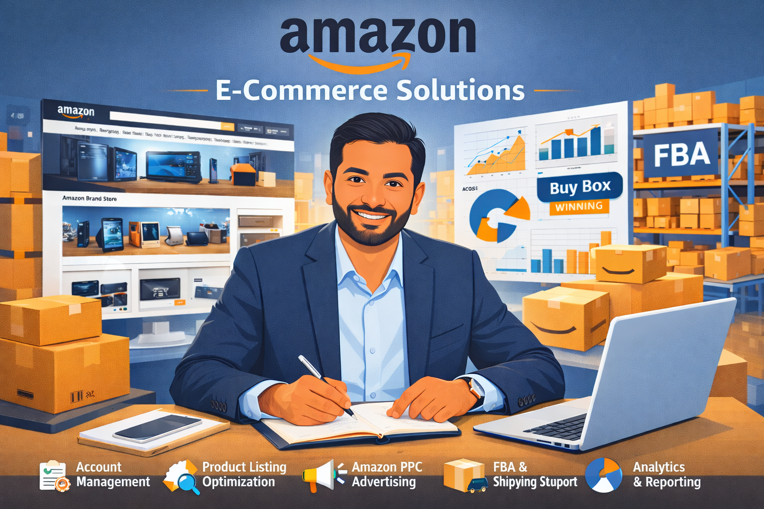 Amazon E-Commerce Services help businesses successfully sell, manage, and grow their brand on Amazon’s marketplace. We provide complete end-to-end solutions, including seller account setup, product listing optimization, Amazon SEO, advertising (PPC), inventory management, and brand building. Our expert team ensures your products gain maximum visibility, win the Buy Box, and achieve consistent sales growth while fully complying with Amazon policies. With data-driven strategies and continuous performance monitoring, we help you scale your Amazon business profitably and hassle-free.